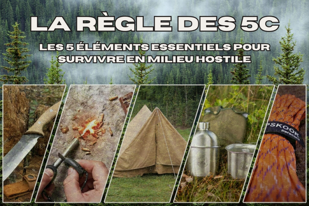 La règle des 5C Les 5 Piliers Indispensables pour Survivre Résumé. La règle des 5C est une base incontournable du survivalisme moderne. Elle regroupe cinq éléments essentiels permettant d’assurer les priorités vitales en situation d’urgence : outil de coupe, moyen de combustion, abri, récipient et cordage. Cette méthode simple et